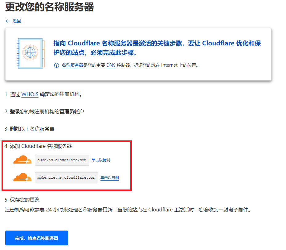 你需要按 Cloudflare 的提示,到你的域名注册机构(例如:万网,腾讯云等域名供应商),修改域名的名称服务器(即添加 NS 记录)。更改生效后,域名解析将转到 CF 托管,CDN 也同时生效。