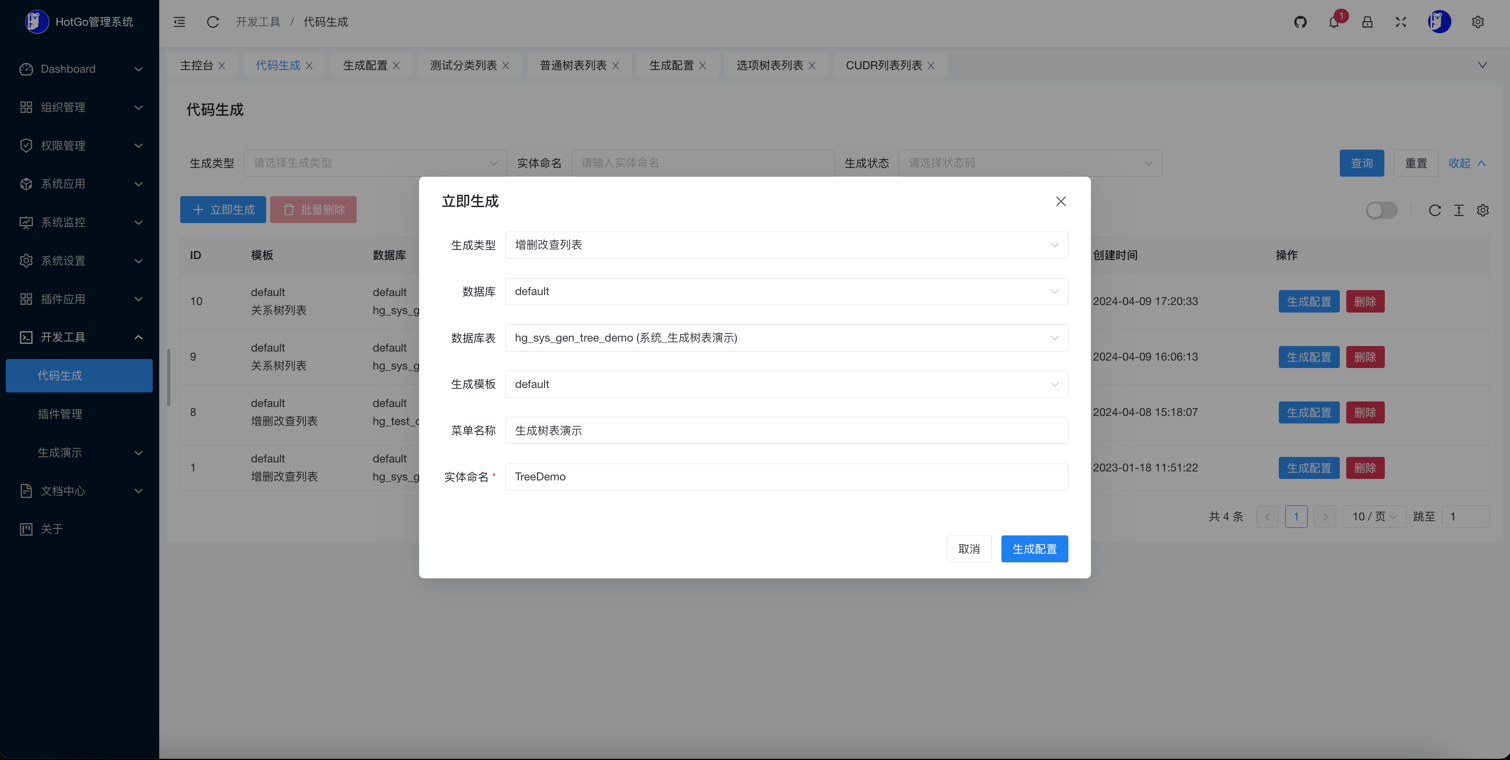 - 登录HotGo后台 -> 开发工具 -> 代码生成 -> 找到立即生成按钮并打开,选择和填写如下参数: