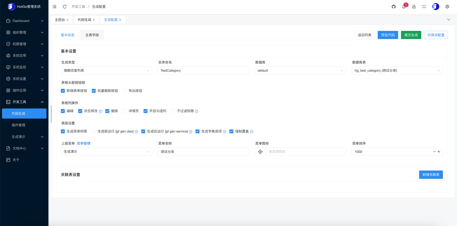 - 你可以在该页面调整生成表格表头/表列的接口功能、菜单权限、高级设置和关联表设置