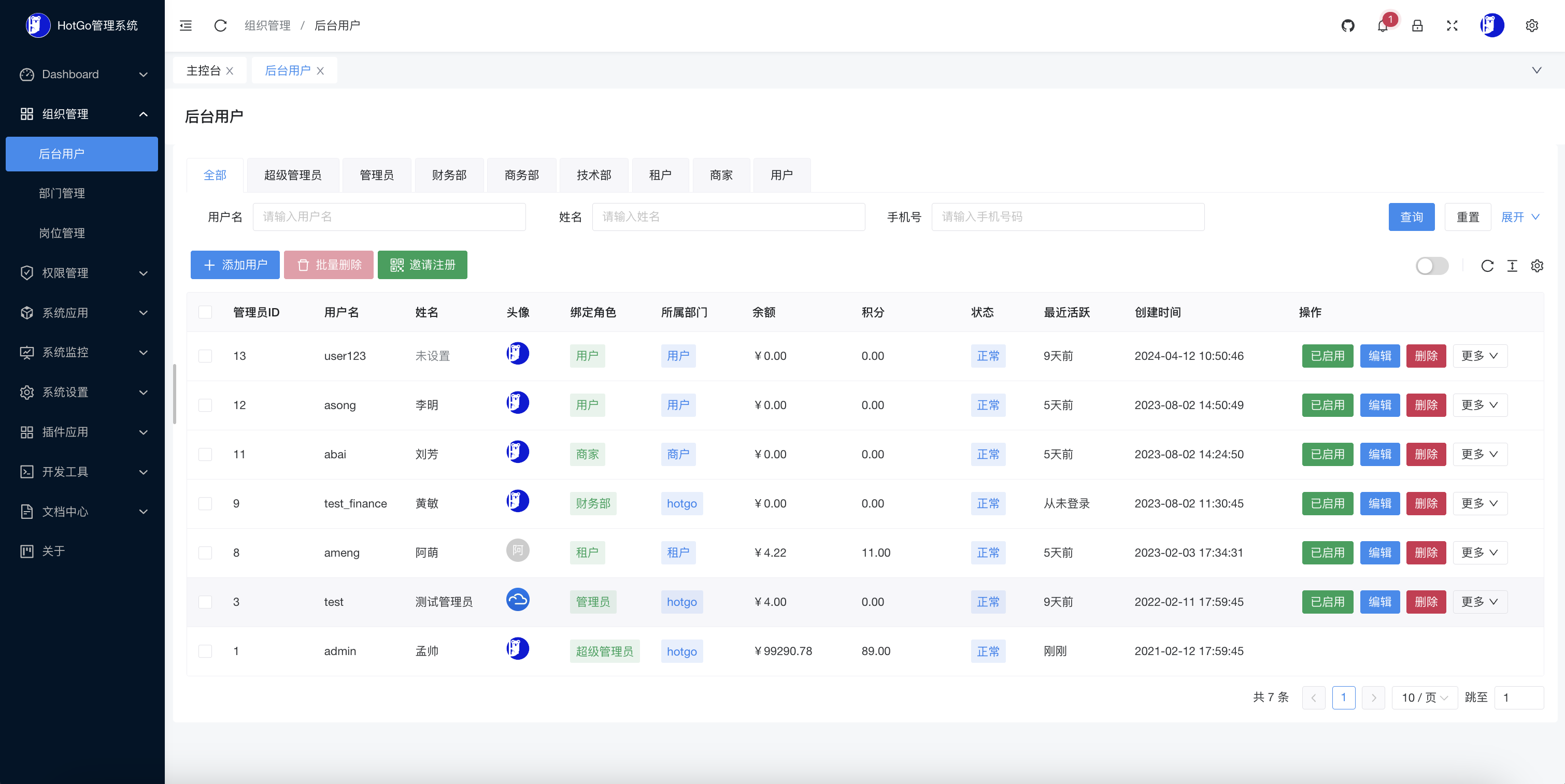 - 部门管理:配置系统组织机构(公司、部门、岗位),树结构展现支持数据权限。