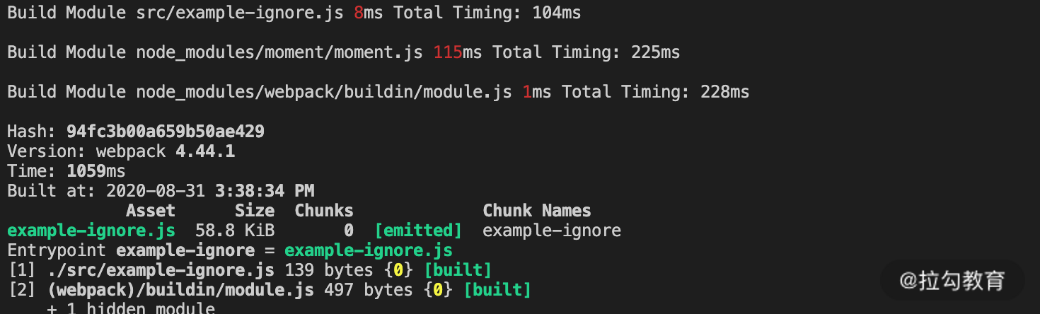 但对于大多数情况而言,项目中只需要引入本国语言包即可。而 Webpack 提供的 IgnorePlugin 即可在构建模块时直接剔除那些需要被排除的模块,从而提升构建模块的速度,并减少产物体积,如下面的图片所示。