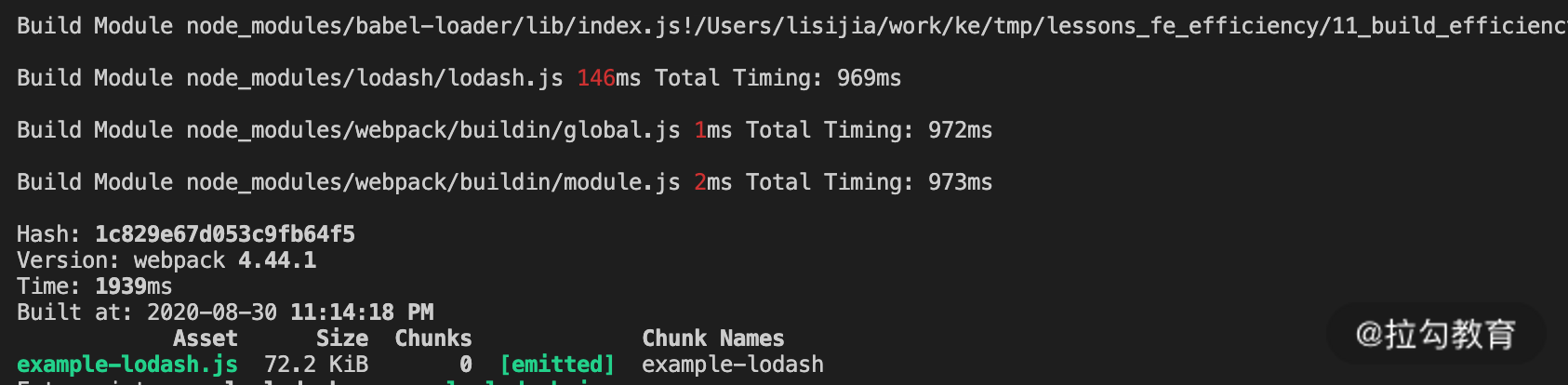 第二种典型的减少执行模块的方式是按需引入。这种方式一般适用于工具类库性质的依赖包的优化,典型例子是 lodash 依赖包。通常在项目里我们只用到了少数几个 lodash 的方法,但是构建时却发现构建时引入了整个依赖包,如下图所示: