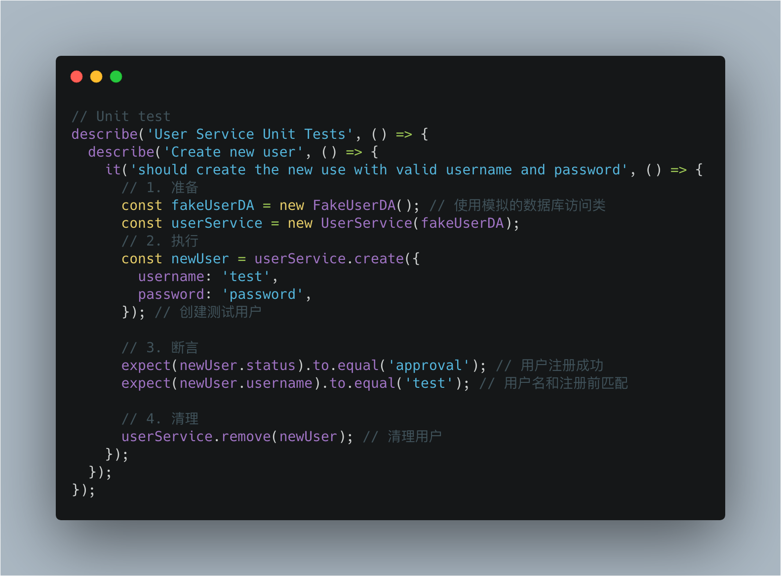 比如说 UserService 这个类,有一个注册用户的函数,现在要对它写一个单元测试代码,那么看起来就像下面这样: