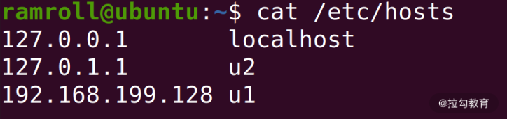 上图中,我在使用ssh指令从机器u1登录我的另一台虚拟机u2。这里u1和u2对应着 IP 地址,是我在/etc/hosts中设置的,如下图所示: