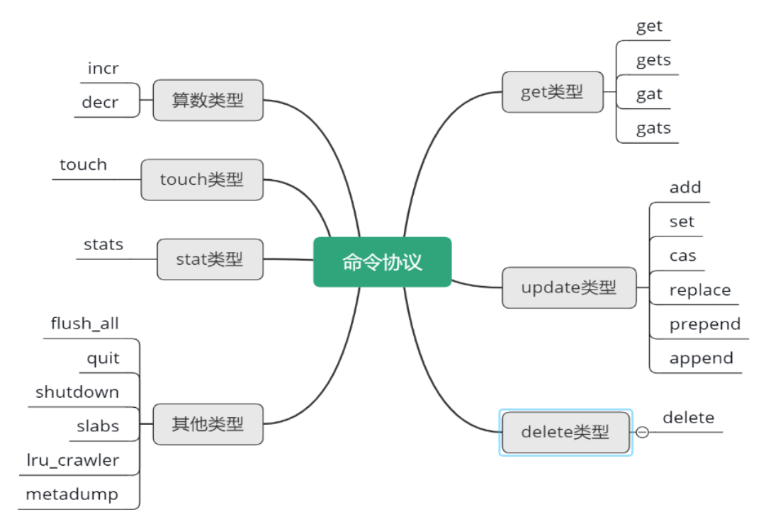 Mc 的命令协议从直观逻辑上可以分为获取类型、变更类型、其他类型。但从实际处理层面区分,则可以细分为 get 类型、update 类型、delete 类型、算术类型、touch 类型、stats 类型,以及其他类型。对应的处理函数为,process_get_command, process_update_command, process_arithmetic_command, process_touch_command等。每个处理函数能够处理不同的协议,具体参见下图所示思维导图。