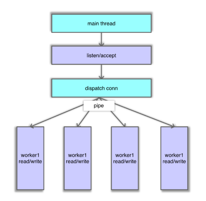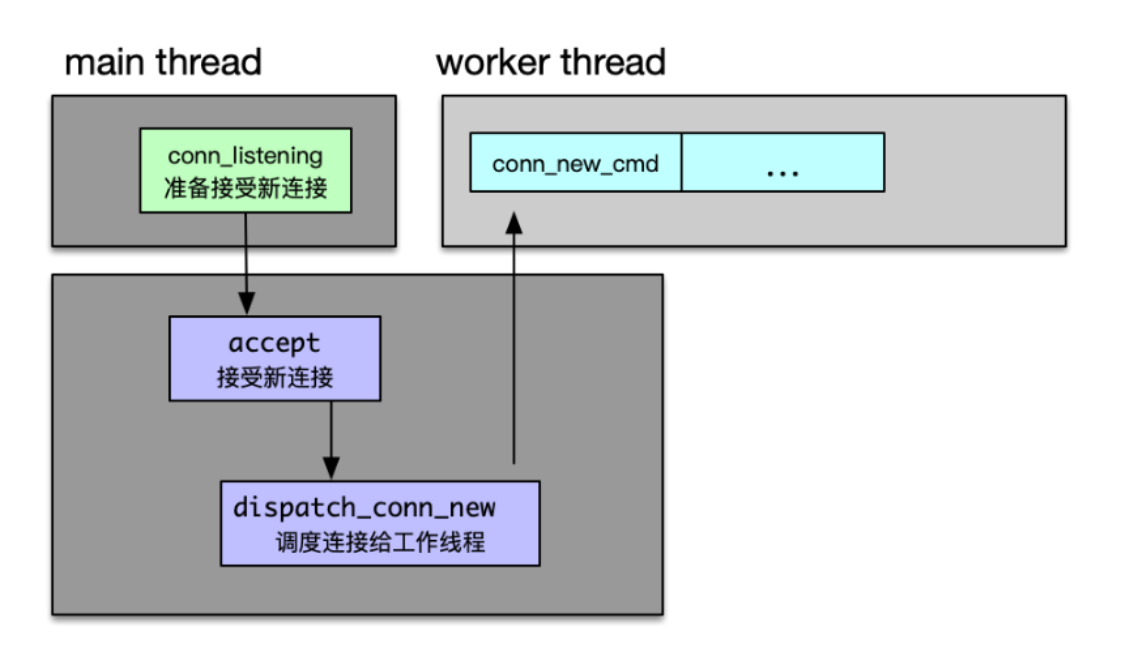 Worker 线程监听管道,当收到主线程通过管道发送的消息后,工作线程中的连接进入 conn_new_cmd 状态,创建 conn 结构体,并做一些初始化重置操作,然后进入 conn_waiting 状态,注册读事件,并等待网络 IO。