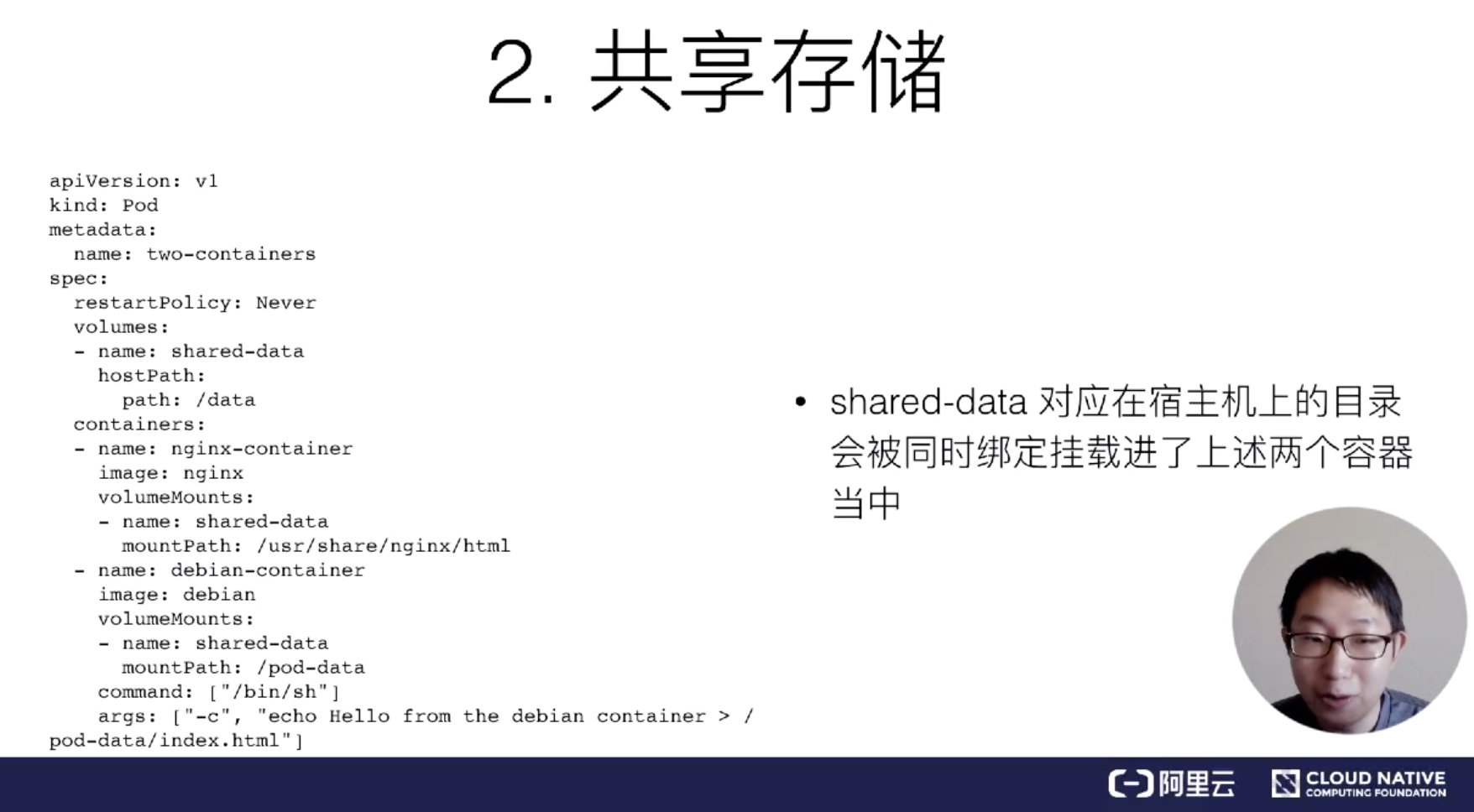 比如说现在有两个容器,一个是 Nginx,另外一个是非常普通的容器,在 Nginx 里放一些文件,让我能通过 Nginx 访问到。所以它需要去 share 这个目录。我 share 文件或者是 share 目录在 Pod 里面是非常简单的,实际上就是把 volume 变成了 Pod level。然后所有容器,就是所有同属于一个 Pod 的容器,他们共享所有的 volume。