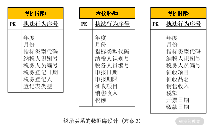 首先,看看以上案例。“执法行为”通过继承分为“正确行为”和“过错行为”。如果这种继承关系的子类不多(一般就 2 ~ 3 个),并且每个子类的个性化字段也不多(3 个以内)的话,则可以使用一个表来记录整个继承关系。在这个表的中间有一个标识字段,标识表中的每条记录到底是哪个子类,这个字段的前面部分罗列的是父类的字段,后面依次罗列各个子类的个性化字段。