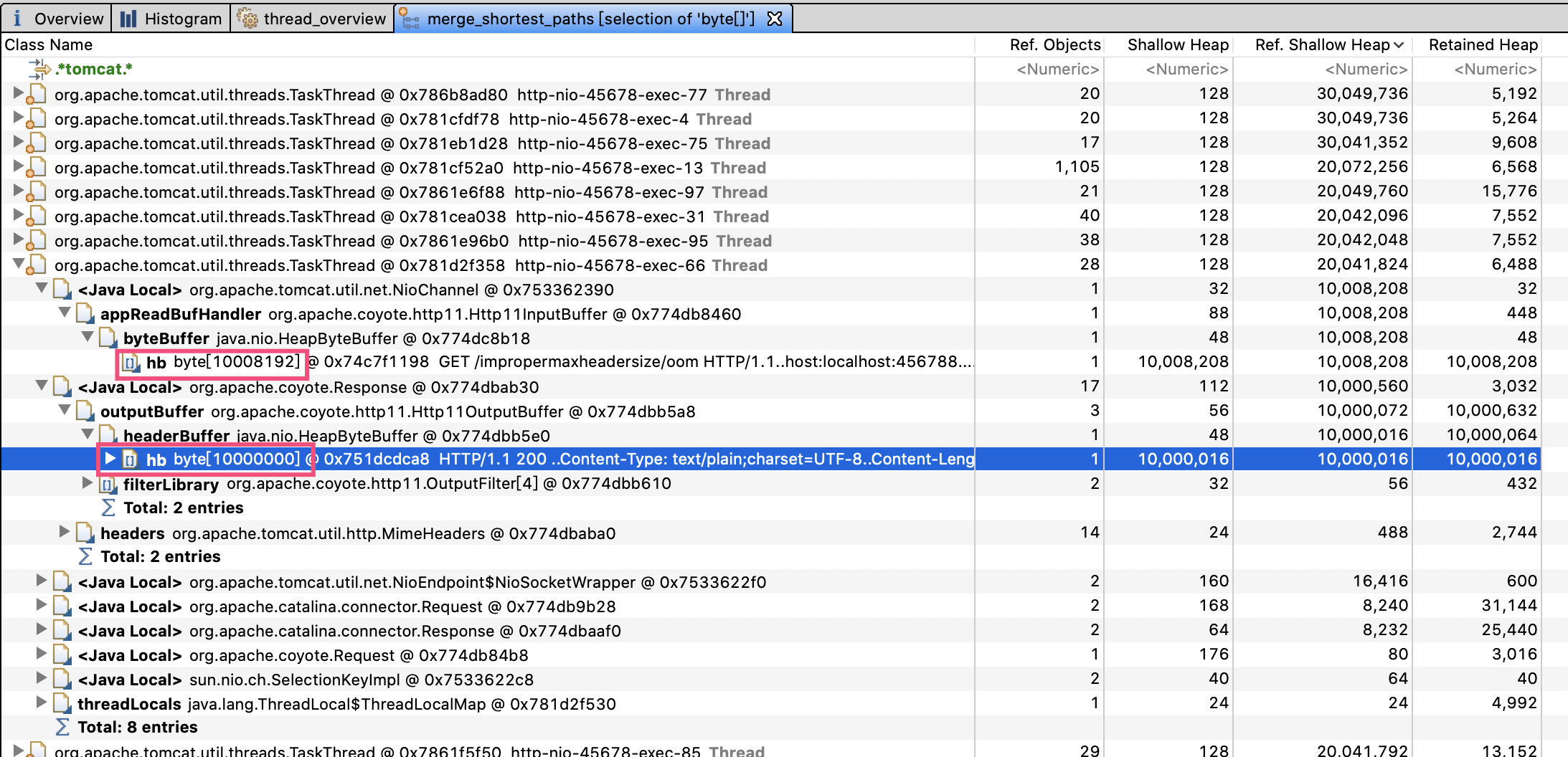 通过查看引用可以发现,大量引用都是 Tomcat 的工作线程。大部分工作线程都分配了两个 10M 左右的数组,100 个左右工作线程吃满了内存。第一个红框是 Http11InputBuffer,其 buffer 大小是 10008192 字节;而第二个红框的 Http11OutputBuffer 的 buffer,正好占用 10000000 字节: