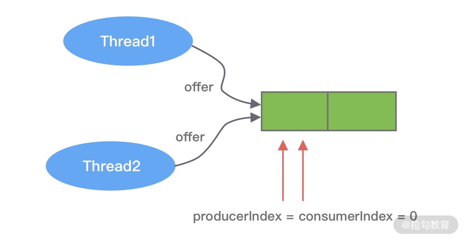 在初始化状态,producerLimit 与队列的容量是相等的,对应到 MpscArrayQueueTest 代码示例中,producerLimit = capacity = 2,而 producerIndex = consumerIndex = 0。接下来 Thread1 和 Thread2 并发向 MpscArrayQueue 中存放数据,如下图所示。