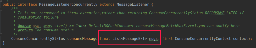 消息消费一次最大消费的消息条数,这个值得是下图中参数 ist<MessageExt> msgs 中消息的最大条数。