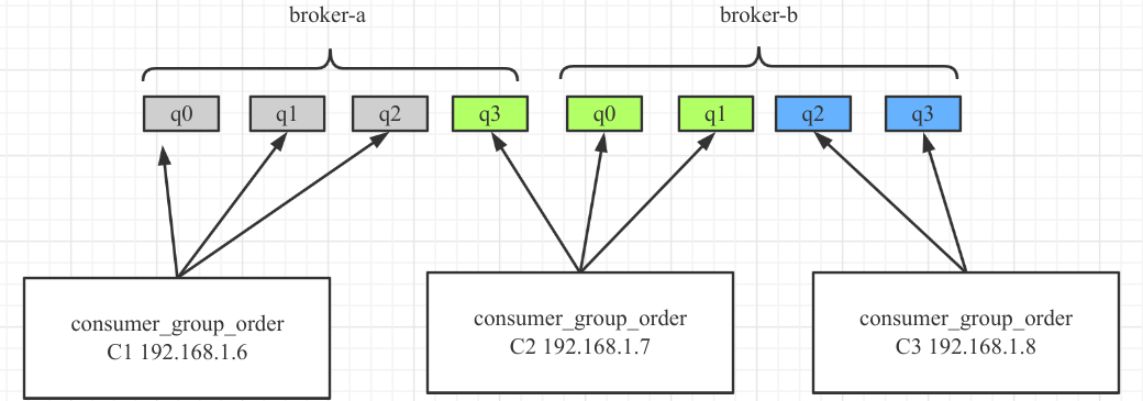 平均连续分配算法。主要的特点是一个消费者分配的消息队列是连续的。