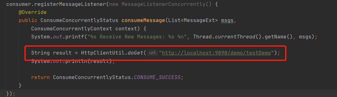 定位到代码后再定位问题就比较简单的,通常的网络调用需要设置超时时间,这里由于没有设置超时时间,导致一直在等待对端的返回,从而消息消费进度无法向前推进,解决方案:设置超时时间。