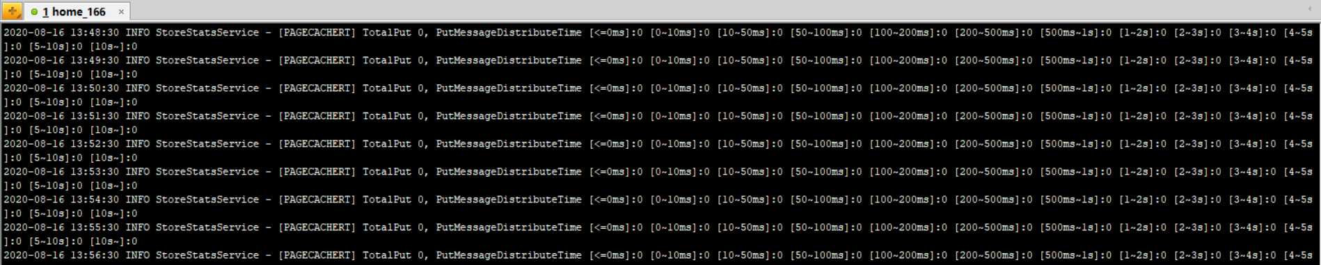 在 RocketMQ Broker 中会每隔 1 分钟打印出上一分钟消息写入的耗时分布,例如 [<=0ms] 表示在这一秒钟写入消息在 Broker 端的延时小鱼 0ms 的消息条数,其他的依次类推,通常在 100~200ms 在上万次消息发送中也不会出现 1 次。从这里基本能看出 Broker 端写入的压力。