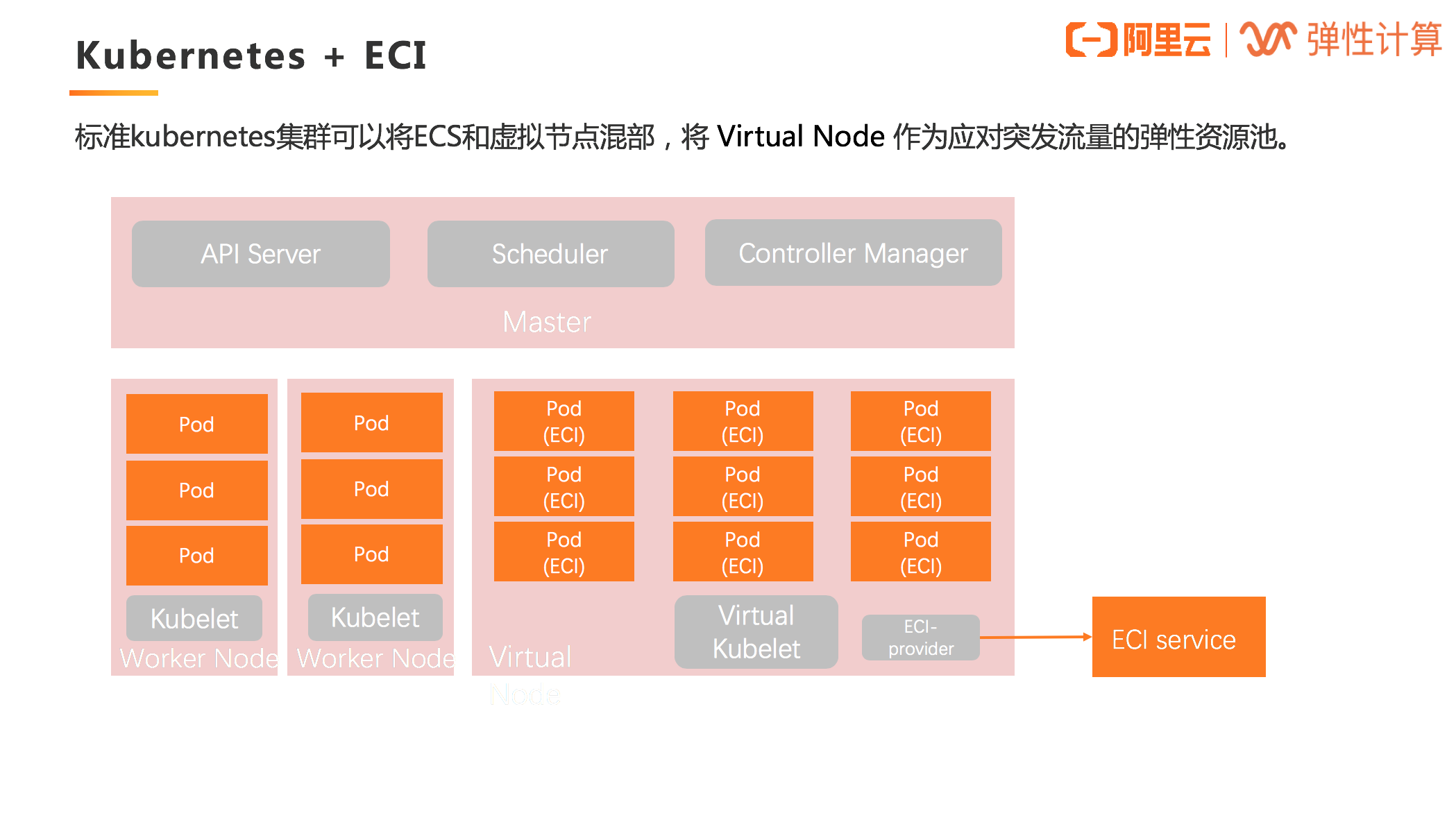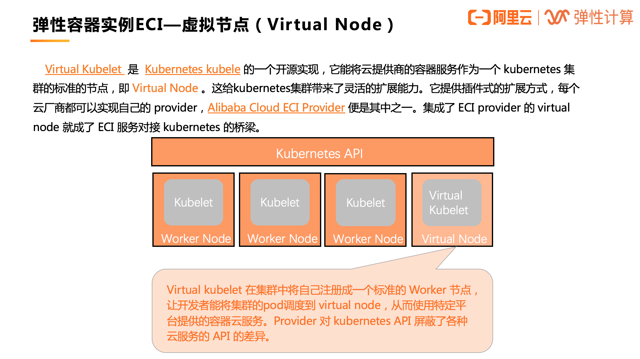 不论是托管版的 Kubernetes(ACK)还是 Serverless 版 Kubernetes(ASK),都可以使用 ECI 作为容器资源层,其背后的实现就是借助虚拟节点技术,通过一个叫做 Virtual Node 的虚拟节点对接 ECI。