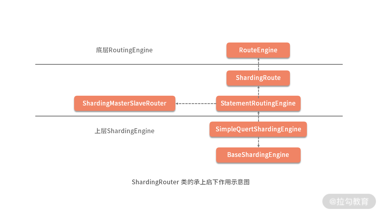 下图展示了 ShardingRouter 的这种定位关系。关于各种 RoutingEngine 的介绍是我们下一课时的内容,今天我们先将基于 ShardingRouter 讨论它的上层结构,从而引出了 ShardingEngine。