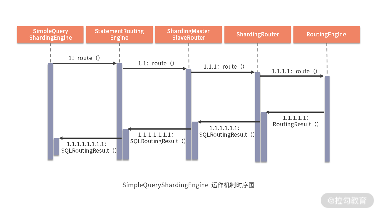 至此,关于 ShardingSphere 路由引擎部分的内容基本都介绍完毕。对于上层结构而言,我们以 SimpleQueryShardingEngine 为例进行了展开,对于 PreparedQueryShardingEngine 的处理方式也是类似。作为总结,我们通过如下所示的时序图来梳理这些路由的主流程。