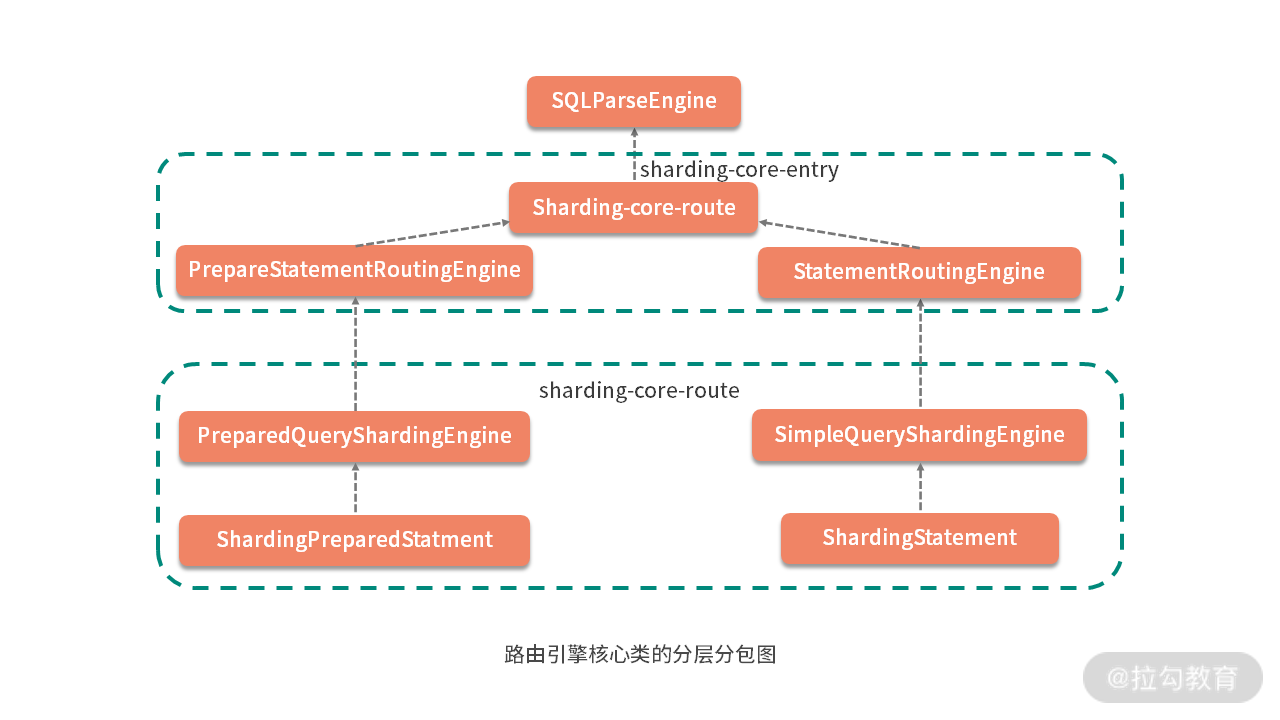 同时,我们也可以把这张图中的类按照其所属的包结构分成两个层次:位于底层的 sharding-core-route 和位于上层的 sharding-core-entry,这也是 ShardingSphere 中所普遍采用的一种分包原则,即根据类的所属层级来组织包结构。关于 ShardingSphere 的分包原则我们在 [《12 | 从应用到原理:如何高效阅读 ShardingSphere 源码?》]中也已经进行了介绍,接下来我们具体分析这一原则在路由引擎中的应用。