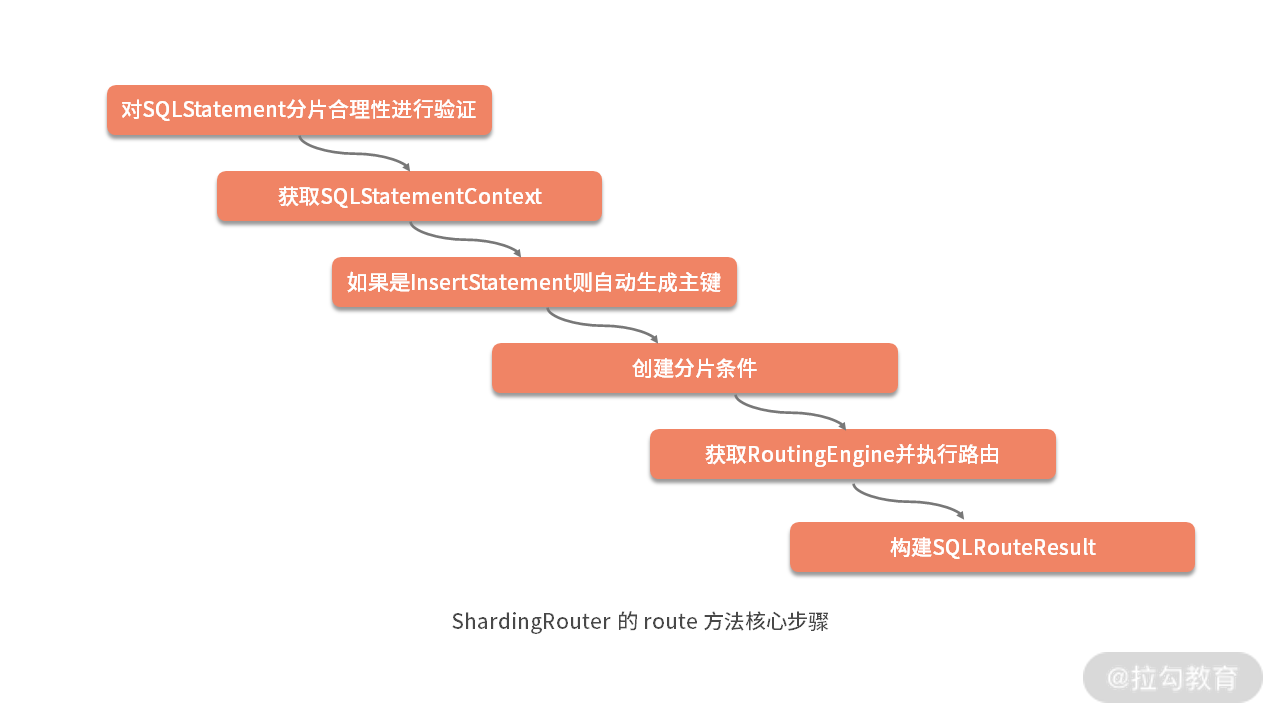 我们回到 ShardingRouter 类,发现其核心方法只有一个,即 route 方法。这个方法的逻辑比较复杂,我们梳理它的执行步骤,如下图所示: