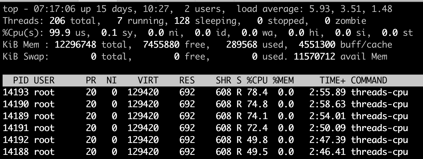 那我们再来跑第二个例子,同样在这个 4 个 CPU 的计算机节点上,如果我们执行 CPU Usage 模拟程序 threads-cpu,设置参数为 6,让这个进程建出 6 个线程,这样每个线程都会尽量去抢占 CPU,但是计算机总共只有 4 个 CPU,所以这 6 个线程的 CPU Usage 加起来只是 400%。