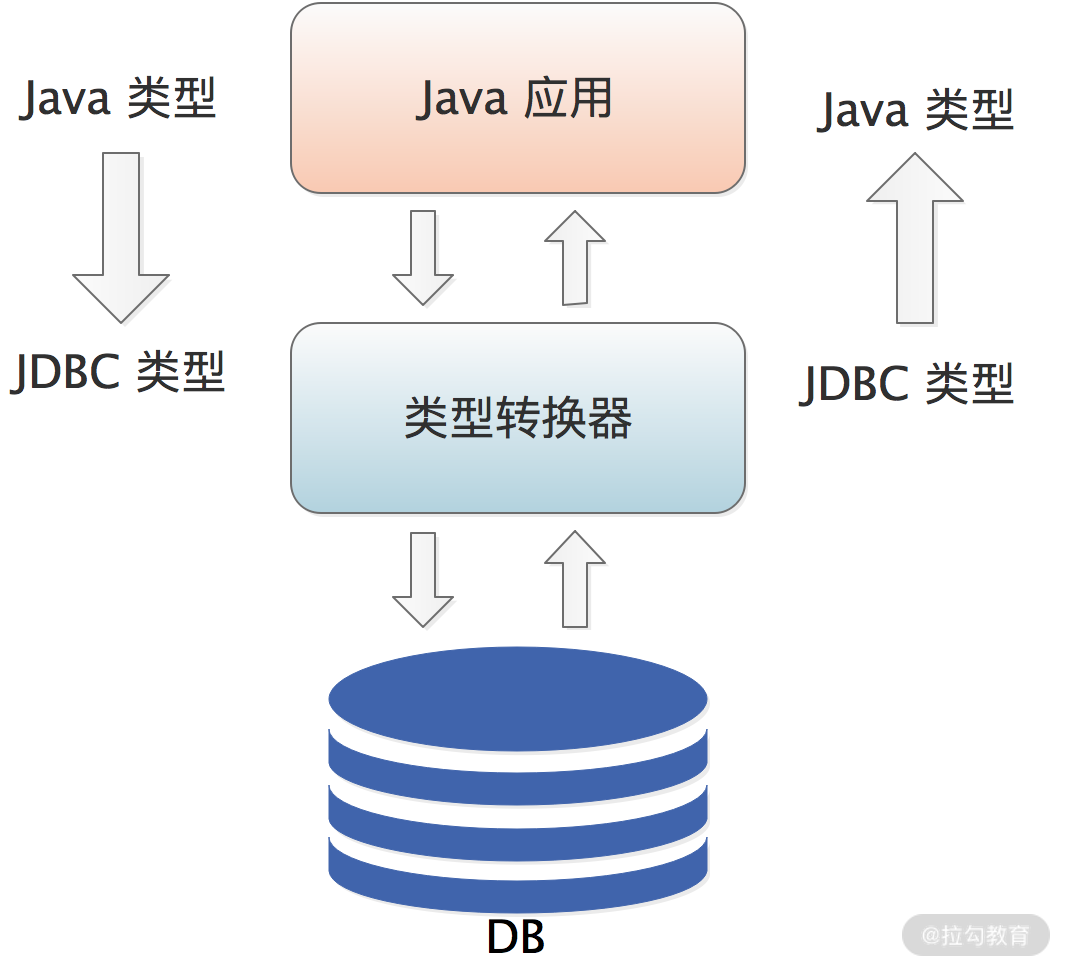 作为一个 Java 程序员,你应该已经具备了使用 JDBC 操作数据库的基础技能。在使用 JDBC 的时候,你会发现 JDBC 的数据类型与 Java 语言中的数据类型虽然有点对应关系,如下图所示,但还是无法做到一一对应,也自然无法做到自动映射。