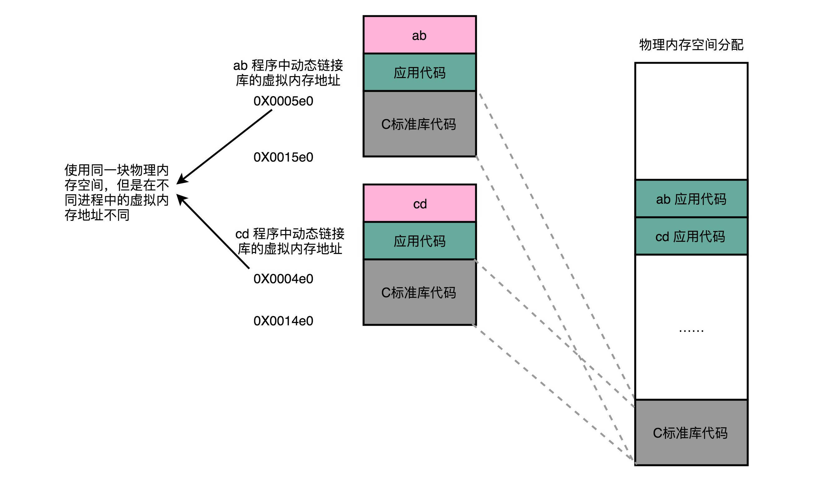 对于所有动态链接共享库的程序来讲,虽然我们的共享库用的都是同一段物理内存地址,但是在不同的应用程序里,它所在的虚拟内存地址是不同的。我们没办法、也不应该要求动态链接同一个共享库的不同程序,必须把这个共享库所使用的虚拟内存地址变成一致。如果这样的话,我们写的程序就必须明确地知道内部的内存地址分配。