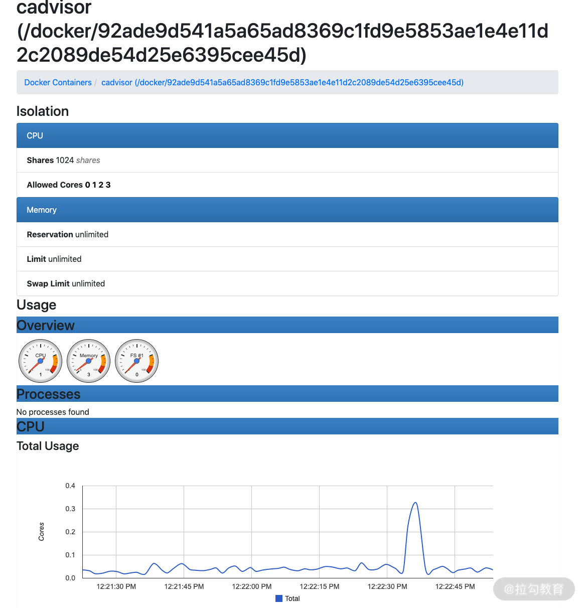 在上图中的Subcontainers 下会列出当前主机上运行的所有容器,点击其中一个容器即可查看该容器的详细运行状态,如下图所示。