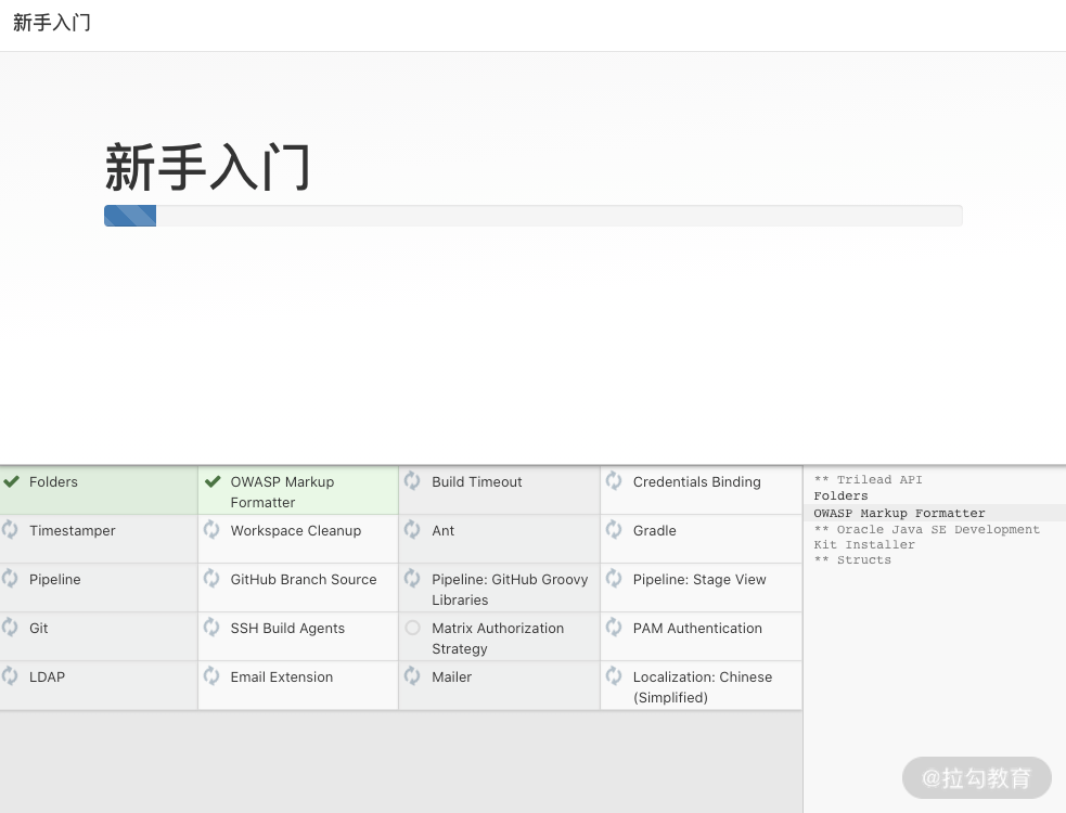 选择好安装推荐的插件后,Jenkins 会自动开始初始化一些常用插件。界面如下: