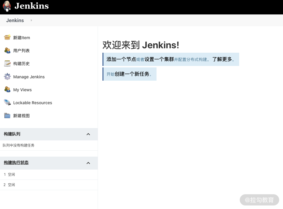 这里,确认 Jenkins 地址,我们就可以进入到 Jenkins 主页了。