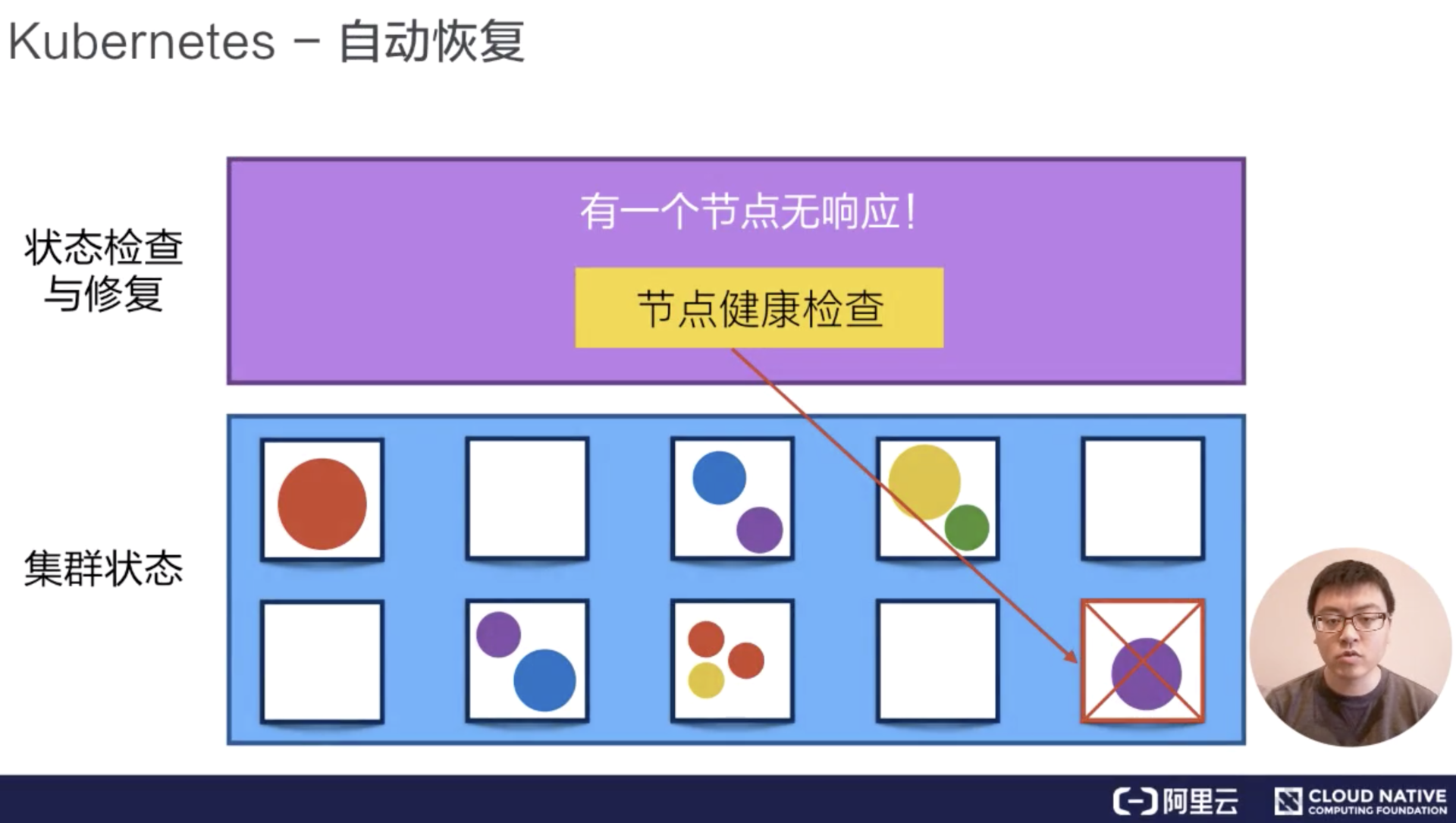 下面 Kubernetes 会把运行在这些失败节点上的容器进行自动迁移,迁移到一个正在健康运行的宿主机上,来完成集群内容器的一个自动恢复。