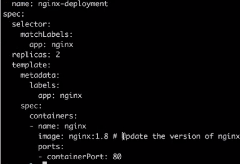 下面我们去升级这个 Deployment 版本,首先下载另外一个 yaml 文件 deployment-update.yaml,可以看到这里面的 image 本身的版本号从 1.7.9 升级到 1.8。