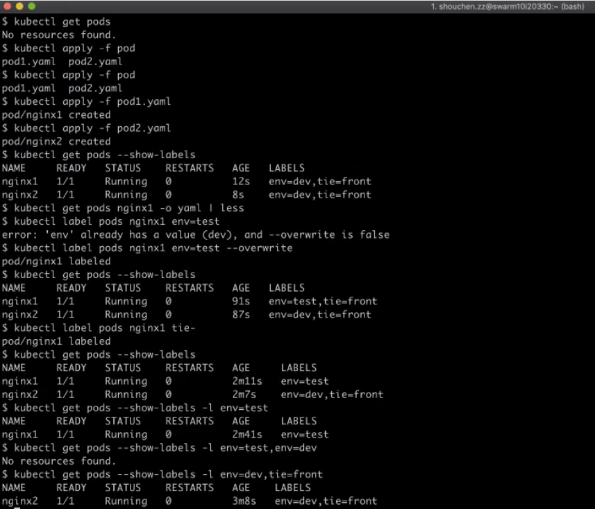 • kubectl get pods —show-labels -l env=dev,tie=front