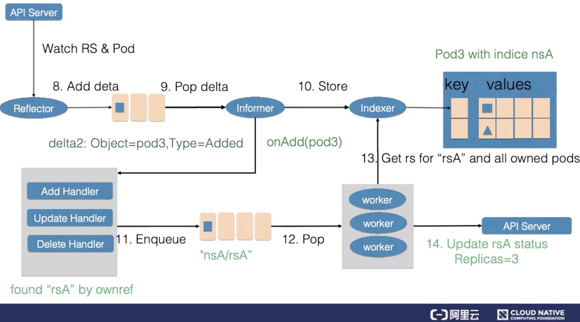 Informer 一方面把新的 ReplicaSet 更新到缓存中,并与 Namespace nsA 作为索引。另外一方面,调用 Update 的回调函数,ReplicaSet 控制器发现 ReplicaSet 发生变化后会把字符串的 nsA/rsA 字符串塞入到工作队列中,工作队列后的一个 Worker 从工作队列中取到了 nsA/rsA 这个字符串的 key,并且从缓存中取到了最新的 ReplicaSet 数据。