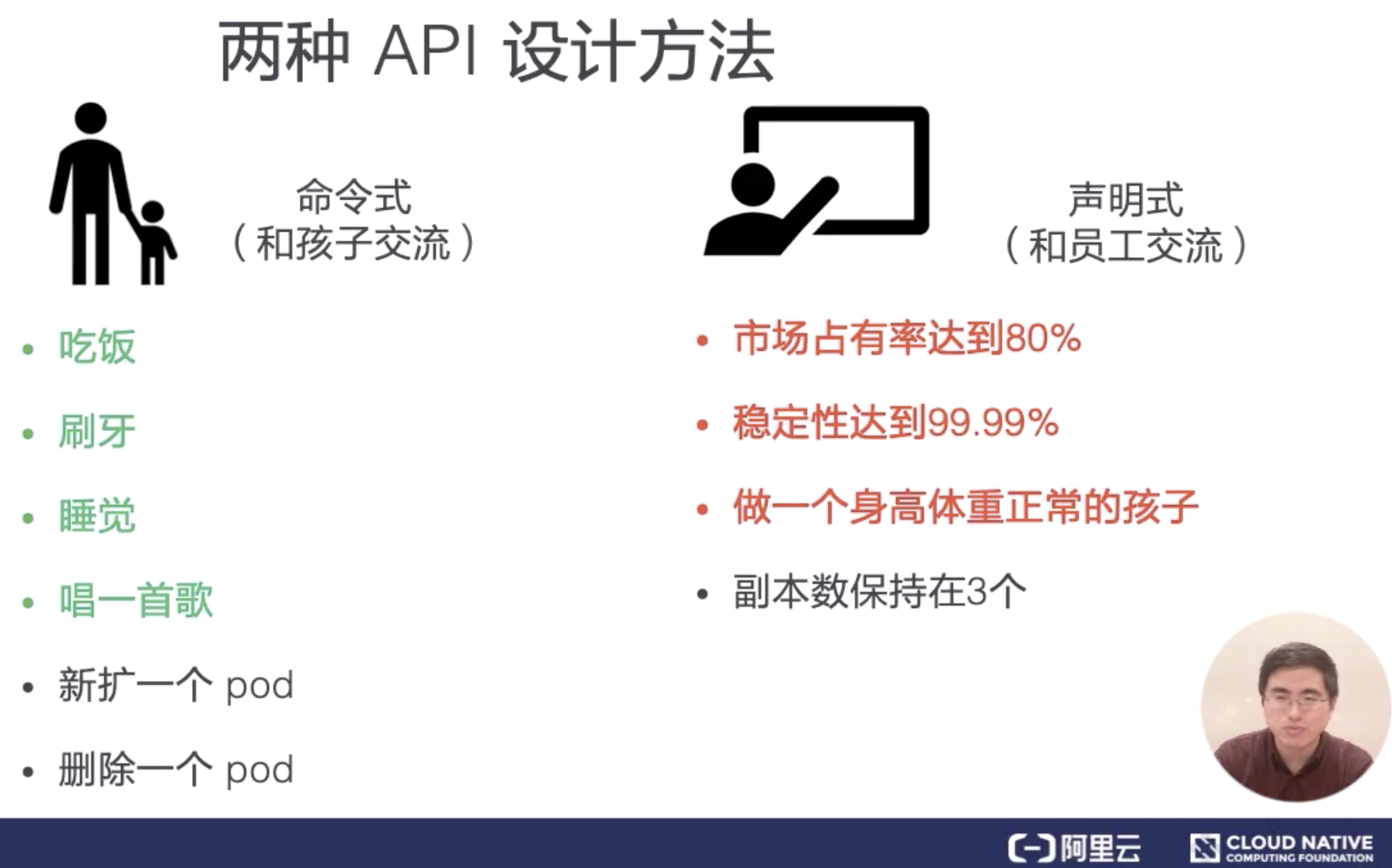 首先,比较两种 API 在交互行为上的差别。在生活中,常见的命令式的交互方式是家长和孩子交流方式,因为孩子欠缺目标意识,无法理解家长期望,家长往往通过一些命令,教孩子一些明确的动作,比如说:吃饭、睡觉类似的命令。我们在容器编排体系中,命令式 API 就是通过向系统发出明确的操作来执行的。