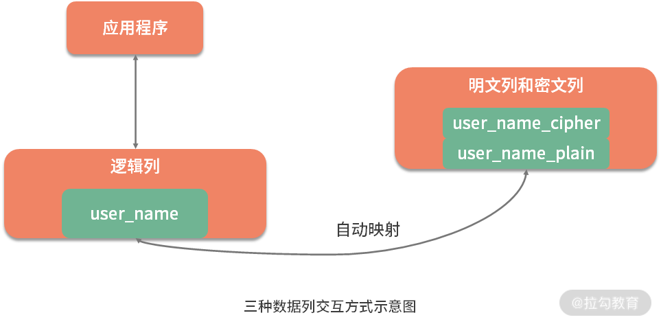 针对这个交互过程,我们希望存在一种机制,能够自动将 user_name 逻辑列映射到 user_name_plain 和 user_name_cipher 列。同时,我们希望提供一种配置机制,能够让开发人员根据需要灵活指定脱敏过程中所采用的各种加解密算法。