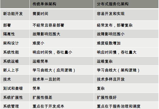 下面这个表格比较了单体应用和分布式架构的优缺点。