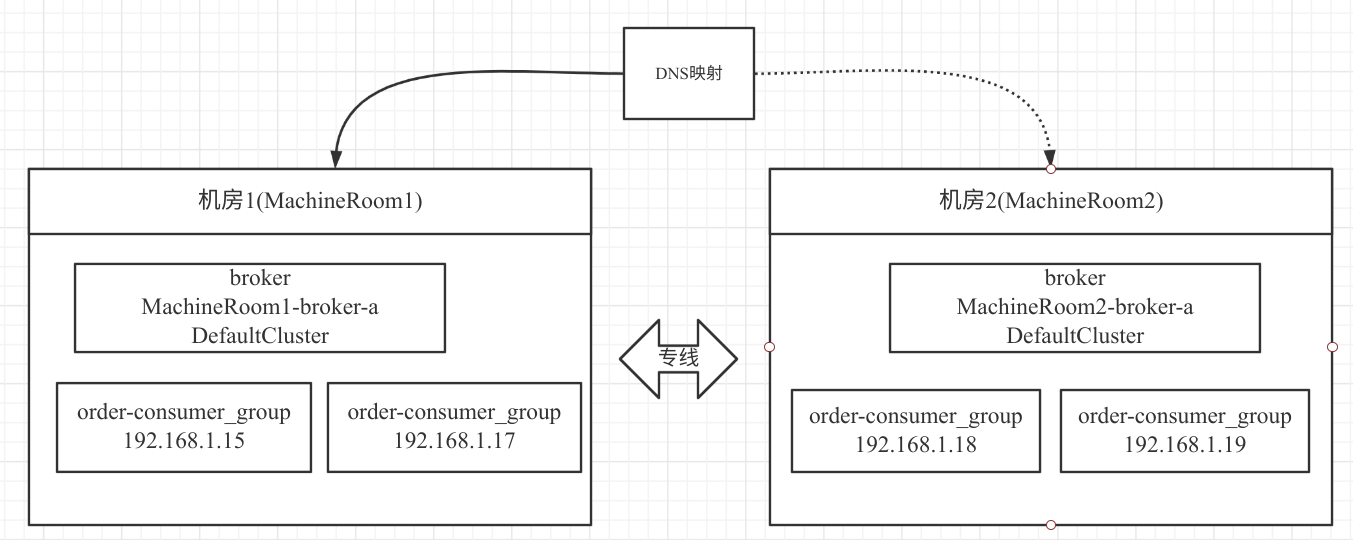 在 RocketMQ 集群在多机房部署方案中本场景下,将一个 RocketMQ 集群部署在两个机房中,即每一个机房都各自部署一个 Broker,两个 Broker 共同承担消息的写入与消费。并且在两个机房都部署了两个消费者。