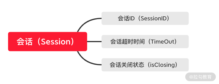 ZooKeeper 的工作方式一般是通过客户端向服务端发送请求而实现的。而在一个请求的发送过程中,首先,客户端要与服务端进行连接,而一个连接就是一个会话。在 ZooKeeper 中,一个会话可以看作是一个用于表示客户端与服务器端连接的数据结构 Session。而这个数据结构由三个部分组成:分别是会话 ID(sessionID)、会话超时时间(TimeOut)、会话关闭状态(isClosing),如下图所示。