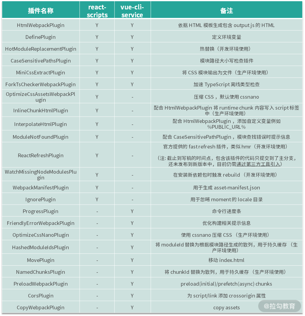 在与构建核心功能相关的方面(html、env、hot、css extract、fast ts check),两者使用的插件相同,而在其他一些细节功能上各有侧重,例如 React 的 inline chunk 和 Vue 的 preload。