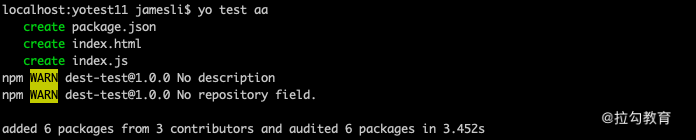 在完成生成器的基本功能后,我们就可以通过在生成器目录里 npm link ,将对应生成器包挂载到全局依赖下,然后进入待创建项目的目录中,执行 yo 创建命令即可。 (如需远程安装,则需要先将生成器包发布到 npm 仓库中,支持发布到 @scope/generator-[name] 。)