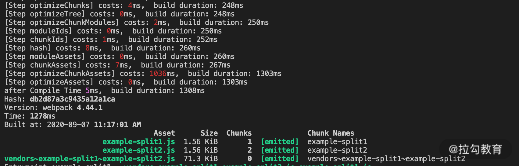 在这个示例中,有两个入口文件引入了相同的依赖包 lodash,在没有额外设置分包的情况下, lodash 被同时打入到两个产物文件中,在后续的压缩代码阶段耗时 1740ms。而在设置分包规则为 chunks:'all' 的情况下,通过分离公共依赖到单独的 Chunk,使得在后续压缩代码阶段,只需要压缩一次 lodash 的依赖包代码,从而减少了压缩时长,总耗时为 1036ms。通过下面两张图片也可以看出这样的变化。