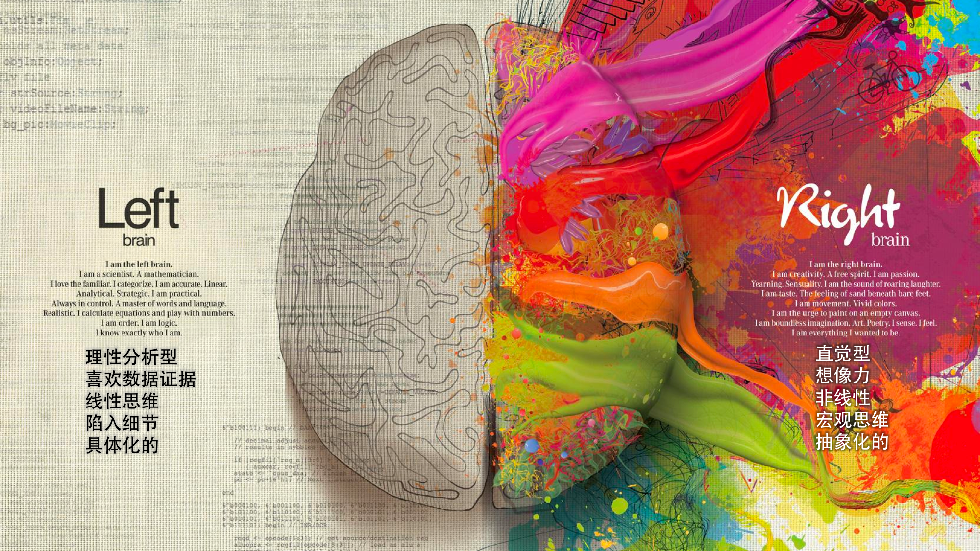 程序编程范式。一个是左脑,一个右脑。我们程序员基本上是在用左脑,左脑是理性分析,喜欢数据证据,线性思维,陷入细节,具体化的,不抽象。但是实际上玩儿出这些东西的都在右脑,函数式,还有像逻辑式的抽象能力都在右脑。所以我们非线性的想象力都在这边,而标准化教育把我们这边已经全部干掉了,我们只剩左边。我们陷入细节,我一说 Java 是最好的程序设计语言,一堆人就来了,找各种各样的细节问题跟你纠缠。