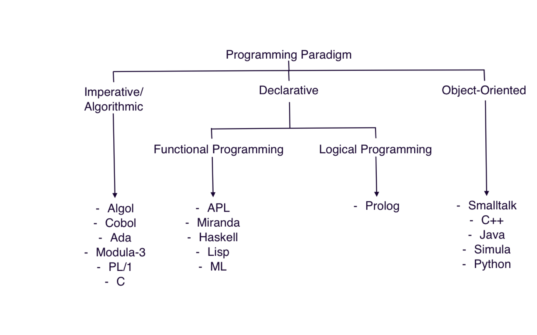 这个世界到今天有很多很多的编程范式,相当复杂。下面这个图比较好地表现了这些各式各样的编程范式。这个图越往左边就越是“声明式的”,越往右边就越不是“声明式的”(指令式的),我们可以看到,函数式编程、逻辑编程,都在左边,而右边是指令式的,有状态的,有类型的。