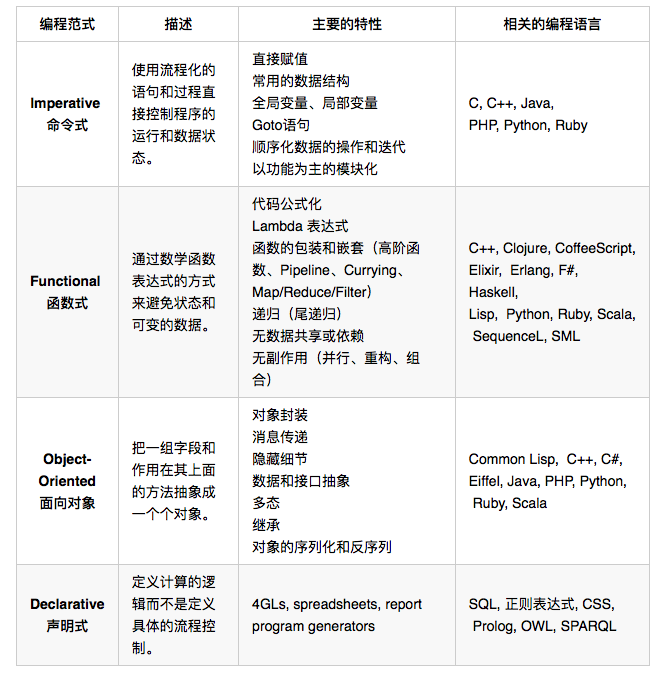 下面再给一张表格说明一下这世界上四大编程范式的类别,它们的特性和主要的编程语言。