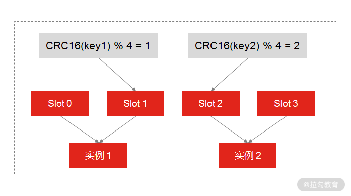 示意图中的分片集群一共有 3 个实例,假设有 4 个哈希槽时,我们就可以通过命令手动分配哈希槽,比如实例 1 保存哈希槽 0 和 1,实例 2 保存哈希槽 2 和 3。