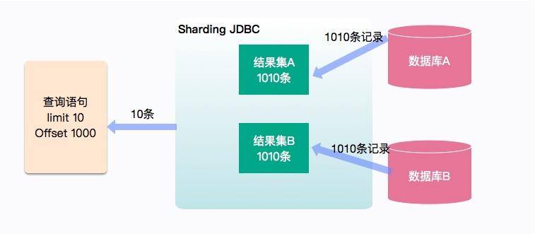 这个过程也是比较好理解的,如图所示,订单数据被存放在两个库中。如果没有提供切分键,查询语句就会被分发到所有的数据库中,这里的查询语句是 limit 10、offset 1000,最终结果只需要返回 10 条记录,但是数据库中间件要完成这种计算,则需要 (1000+10)*2=2020 条记录来完成这个计算过程。如果 offset 的值过大,使用的内存就会暴涨。虽然 sharding-jdbc 使用归并算法进行了一些优化,但在实际场景中,深分页仍然引起了内存和性能问题。
