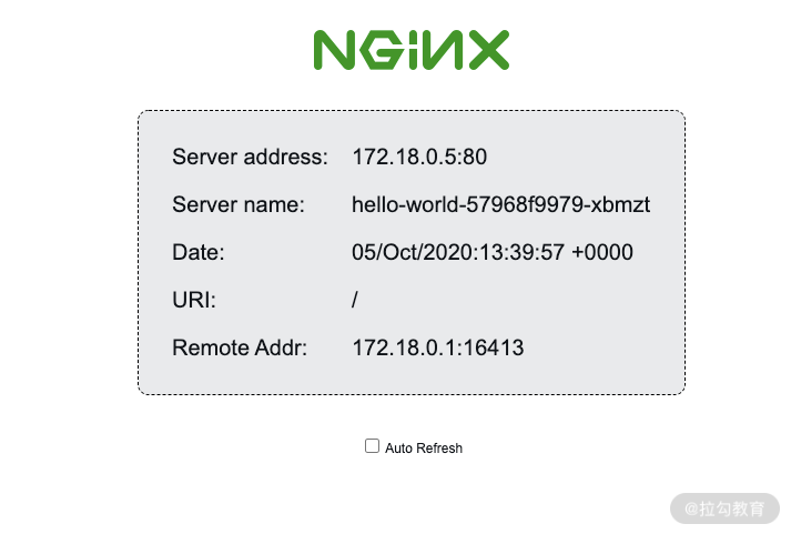 总结下,我们首先使用 Deployment 创建了三个 nginx-hello 的实例,然后使用 Service 的方式随机负载到后端的三个实例,并将服务通过 NodePort 的方式暴露在主机上,使得我们可以直接使用主机的端口访问到容器中的服务。