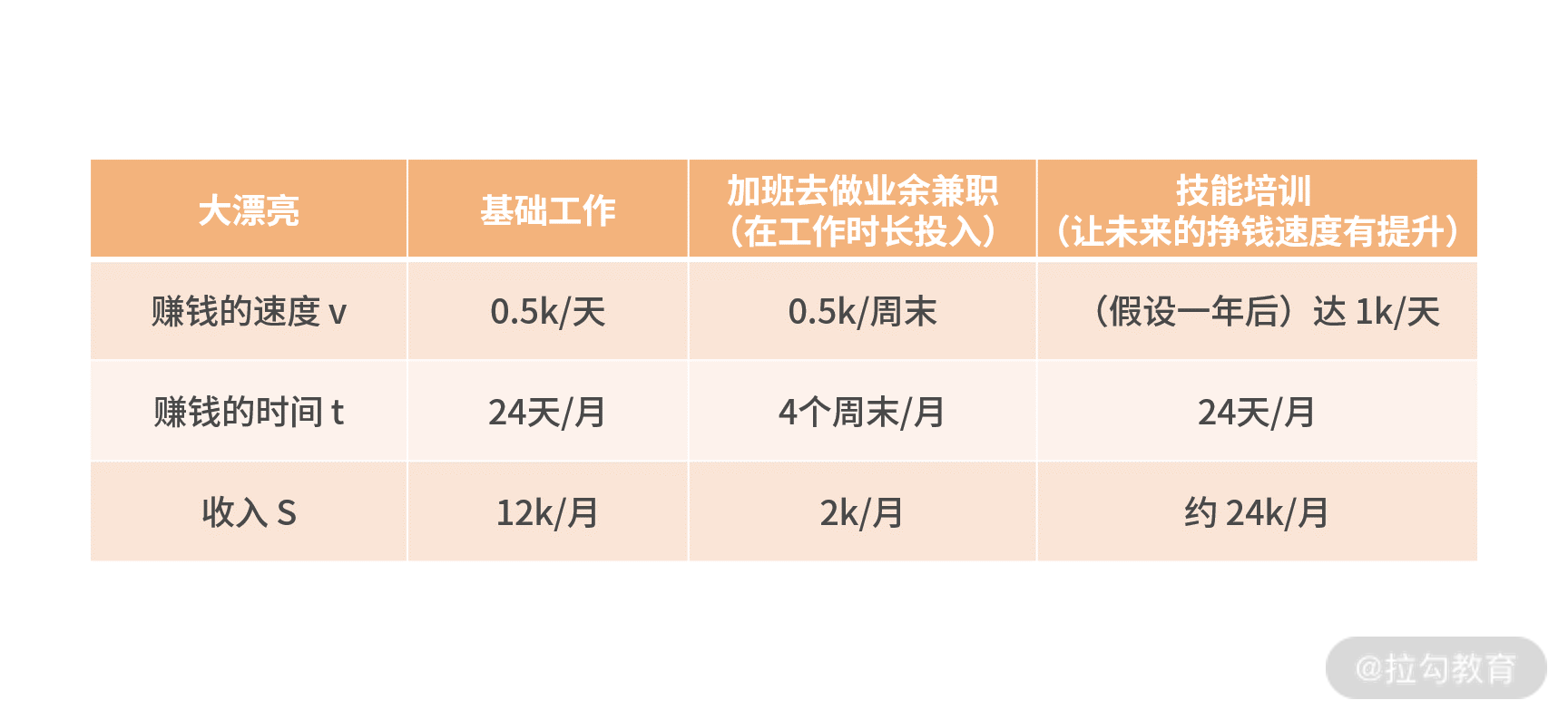 如下表,假设大漂亮的日常工作月薪为 12k,每月周末兼职能挣 2k。若不兼职而去培训,一年后跳槽工资翻番,月薪达 24k,一个月薪就能抵过一年的兼职。所以技能(赚钱的速度)没有办法提高,投入再多时间去加班兼职,也是没用的。