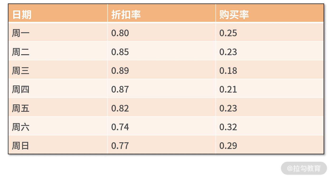 因此,她把这件商品最近一周的数据都提取出来,并且以每天一个样本点,尝试分析购买率和折扣率的关系,她的原始数据如下表所示: