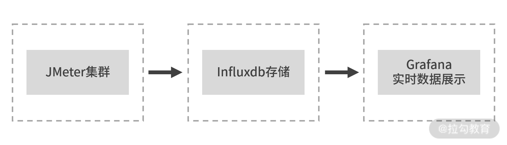 我个人认为原生的实时查看结果是有些鸡肋的,如果想实时且直观地看到每个接口的处理能力,我比较推荐 JMeter+InfluxDB+Grafana 的方式,基本流程如下图所示:
